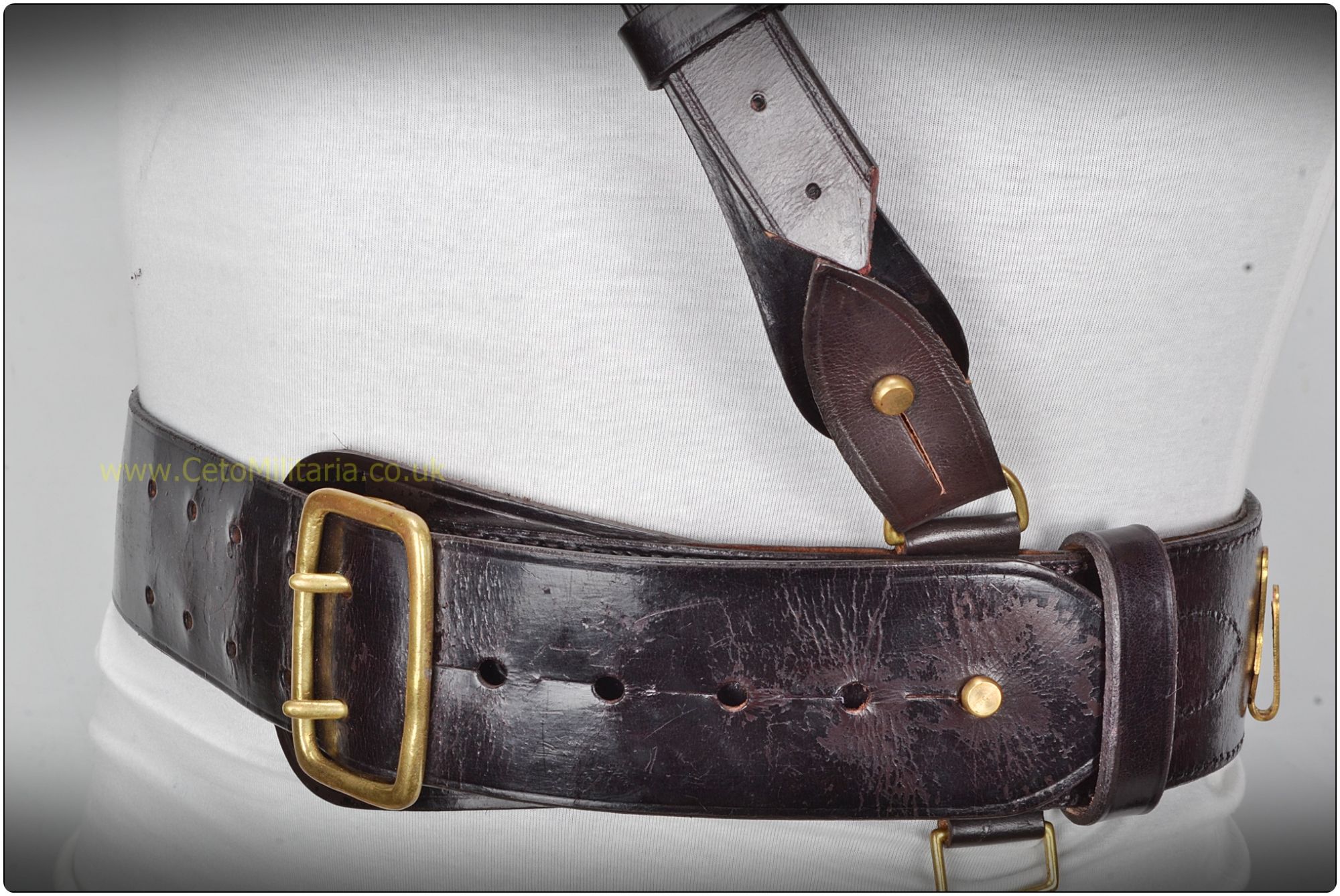 Sam Browne Belt The measurement we give is the circumference of the belt, not the waist size of the wearer. We would recommend a belt at least 3" or 4" larger than your waist size. E.G. "36 to 40" means belt is 36" circumference using the smallest set of holes, 40" circumference using the largest set of holes. Sword frogs available, click here. Date: 2019 Condition: G1 - Light wear but clean & damage-free. SKU: 22829.8 SOLD Date: Undated Condition: G2 - Generally good but has minor surface cracking. Ligh in colour. SKU: 22505.12 SOLD Date: 2011 Condition: G1 - Only very minor wear. Clean & damage-free. SKU: 22829.7 Date: Undated Condition: G1 - Good but irregular/flaked surface, needs polishing. SKU: 22601.304 Date: Undated Condition: G1 - Good. Some surface wear. SKU: 22440.5 Date: Undated Condition: G1 - Good. Some surface wear. SKU: 22823.119 SOLD Date: Undated Condition: G1 - Light surface wear to belt. Cross-strap is smooth. SKU: 22604.3 Date: Undated Condition: G1 - Light surface wear only. SKU: 22857.2 SKU: BeltSamBrowne1 |
